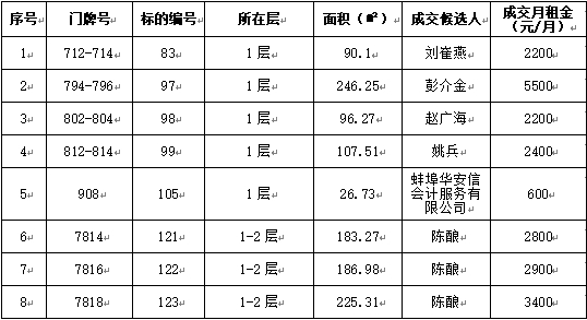 喜迎門小區(qū)部分商鋪公開競(jìng)價(jià)招租工作已經(jīng)結(jié)束,成交候選人已經(jīng)確定。現(xiàn)將競(jìng)租結(jié)果公示如下: