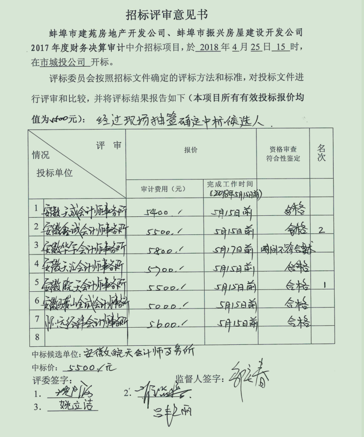 關于蚌埠市建苑房地產(chǎn)開發(fā)公司、蚌埠市振興房屋建設開發(fā)公司2017年財務審計項目的中標公示