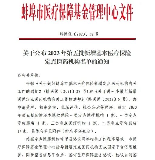 根據(jù)《關(guān)于做好蚌埠市基本醫(yī)療保險(xiǎn)新增定點(diǎn)醫(yī)藥機(jī)構(gòu)有關(guān)工作的通知》(蚌醫(yī)?!?021〕29號(hào))和《關(guān)于進(jìn)一步做好新增醫(yī)保定點(diǎn)醫(yī)藥機(jī)構(gòu)有關(guān)工作的通知》(蚌醫(yī)?!?022〕6號(hào)),經(jīng)申請(qǐng)受理、初審復(fù)審、現(xiàn)場評(píng)估、社會(huì)公示等程序。